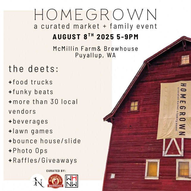 Join us for Homegrown on August 8th from 5–9 PM at McMillin Farm & Brewhouse in Puyallup! Enjoy 30+ local vendors, food trucks, live music, lawn games, photo ops, and fun for the whole family — including a bounce house and giveaways.