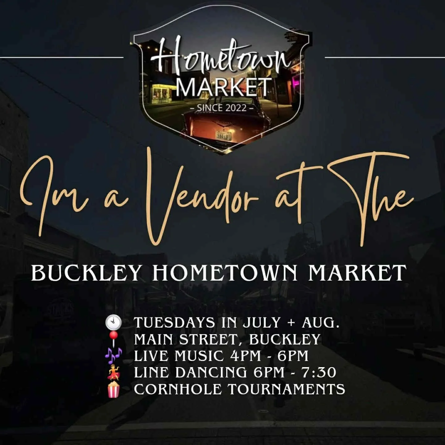 Catch us at the Buckley Hometown Market — happening every Tuesday in July and August on Main Street! Enjoy live music (4–6 PM), line dancing (6–7:30 PM), cornhole, and a vibrant mix of vendors, food, and fun for the whole family.